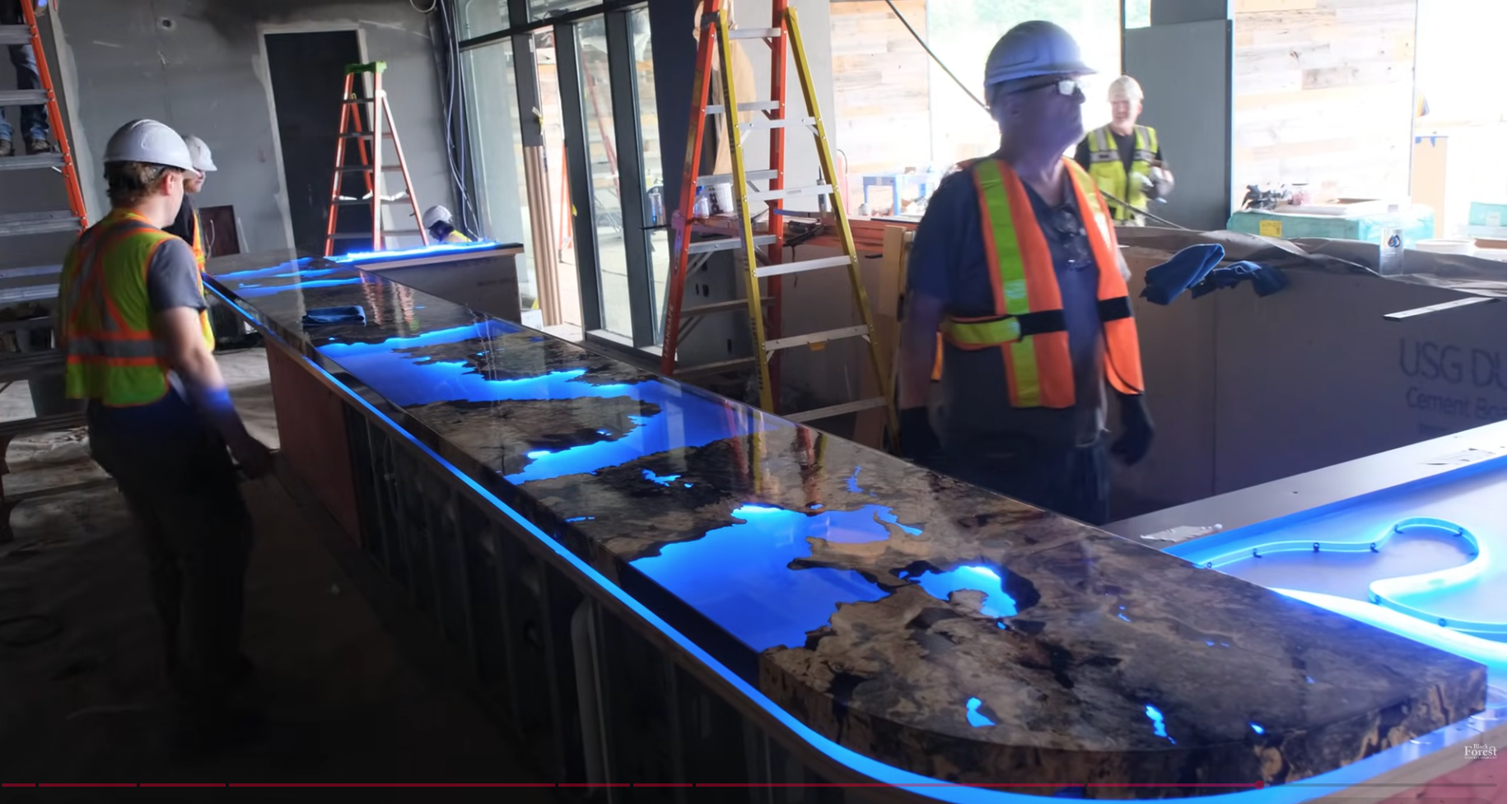 Illuminated epoxy bar tops and reception counters with integrated LED lighting. Create stunning focal points that glow with custom colors.