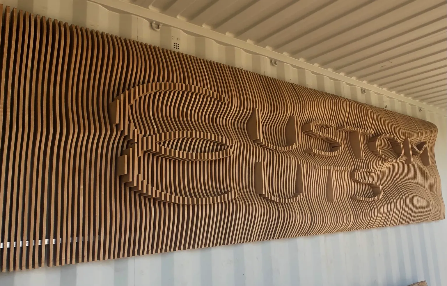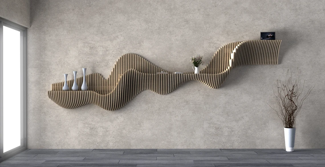 Custom parametric wall sculptures, TV units, and floating shelves. CNC-cut wood slats create flowing organic forms that transform any space.